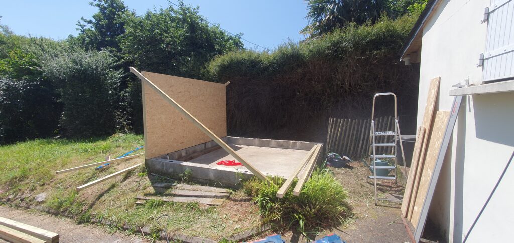 Un ami m’a donné un coup de main pour cette première étape. Ensemble, nous avons retiré les éléments métalliques et nettoyé la dalle en béton existante. Ce travail préparatoire était essentiel pour garantir une base saine avant la pose de la nouvelle ossature.