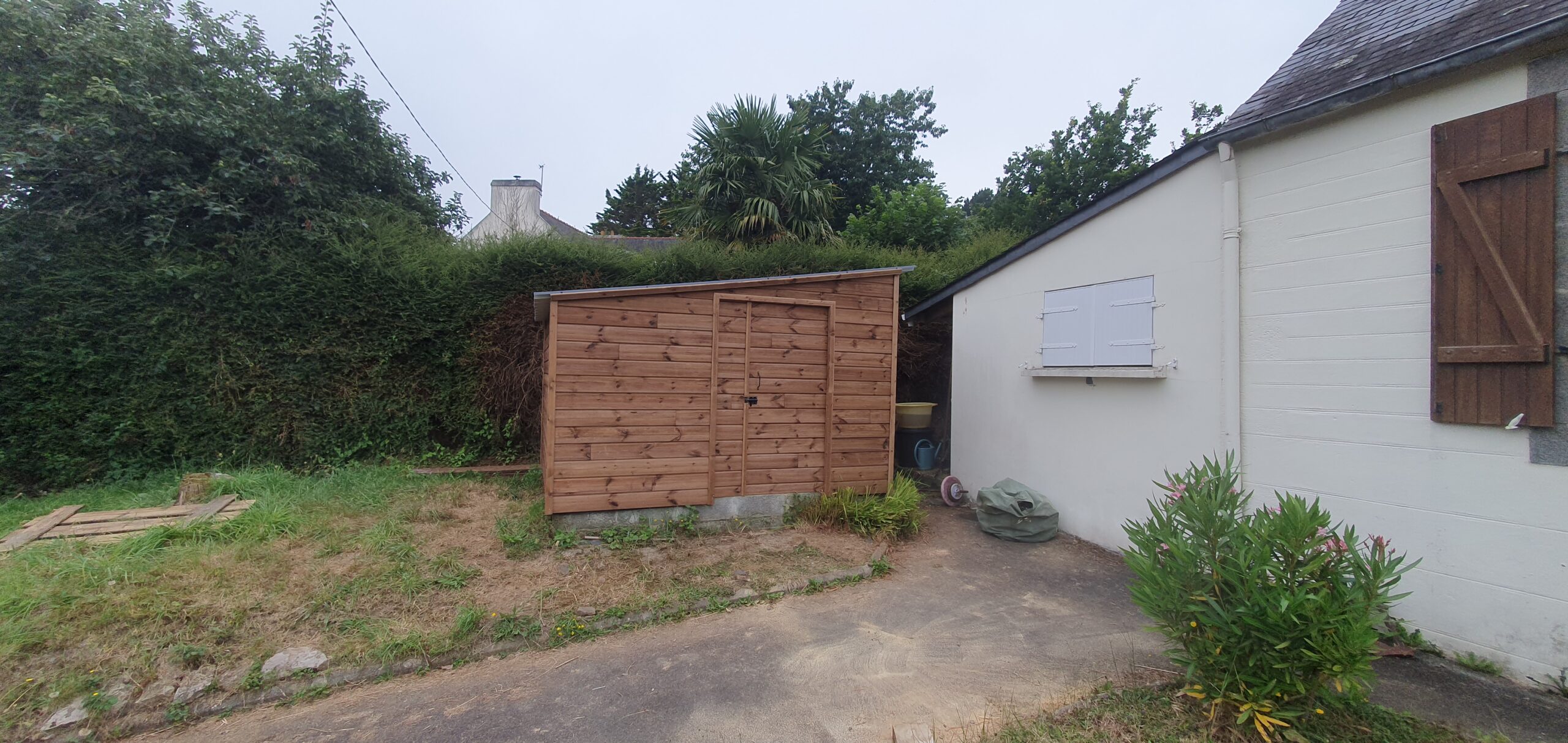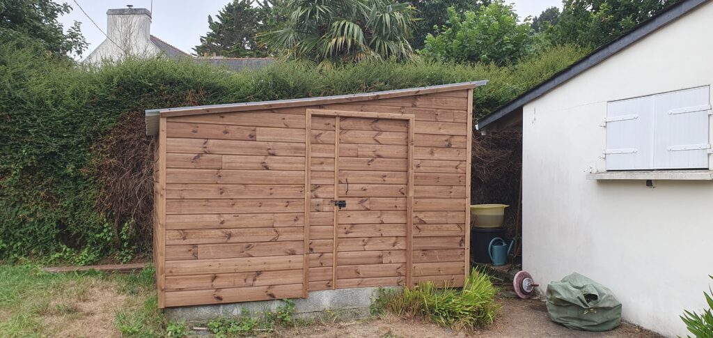 L’ancien abri de jardin, en tôle galvanisée, avait subi les effets de la corrosion et des intempéries. Sa structure, affaiblie et peu esthétique, ne remplissait plus son rôle.